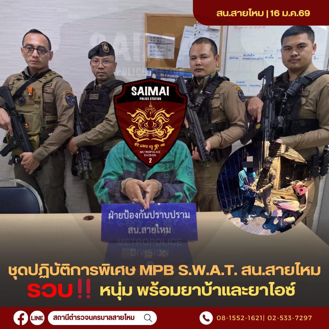 วันที่ 17 ม.ค.69 เวลา 23.30 น. ขณะเจ้าหน้าที่ตำรวจสายตรวจ สน.สายไหม ได้ออกตรวจในพื้นที่ถนนเพิ่มสิน แขวงออเงิน เขตสายไหม กทม. พบผู้ถูกจับขับรถจักรยานยนต์ผ่านมา ลักษณะต้องสงสัย เมื่อพบเจ้าหน้าที่ตำรวจ ผู้ถูกจับออกอาการมีพิรุธ จึงเรียกให้หยุดเพื่อขอตรวจค้น ผลการตรวจค้นพบพบยาไอซ์ น้ำหนัก 0.57 กรัม และยาบ้า จำนวน 9 เม็ด ซุกซ่อนอยู่ในเสื้อแขนยาว ตัวที่ผู้ถูกจับสวมใส่อยู่ สอบถามรับว่าซื้อมาไว้เพื่อเสพ ในราคาละ 1,000 บาท เจ้าหน้าที่ตำรวจจึงทำการจับกุม แจ้งข้อกล่าวหา “มีไว้ในครอบครองซึ่งยาเสพติให้โทษประเภท 1 เมทแอมแฟตามีน (ยาไอซ์,ยาบ้า) โดยไม่ได้รับอนุญาต, เสพยาเสพติดให้โทษประเภท 1 (ยาไอซ์,ยาบ้า) โดยไม่ได้รับอนุญาตและเป็นผู้ขับขี่เสพยาเสพติดให้โทษประเภท 1โดยฝ่าฝืนต่อกฎหมาย“ นำตัวผู้ถูกจับทพร้อมของกลางส่งพนักงานสอบสวน สน.สายไหม เพื่อดำเนินคดีตามกฎหมายต่อไป