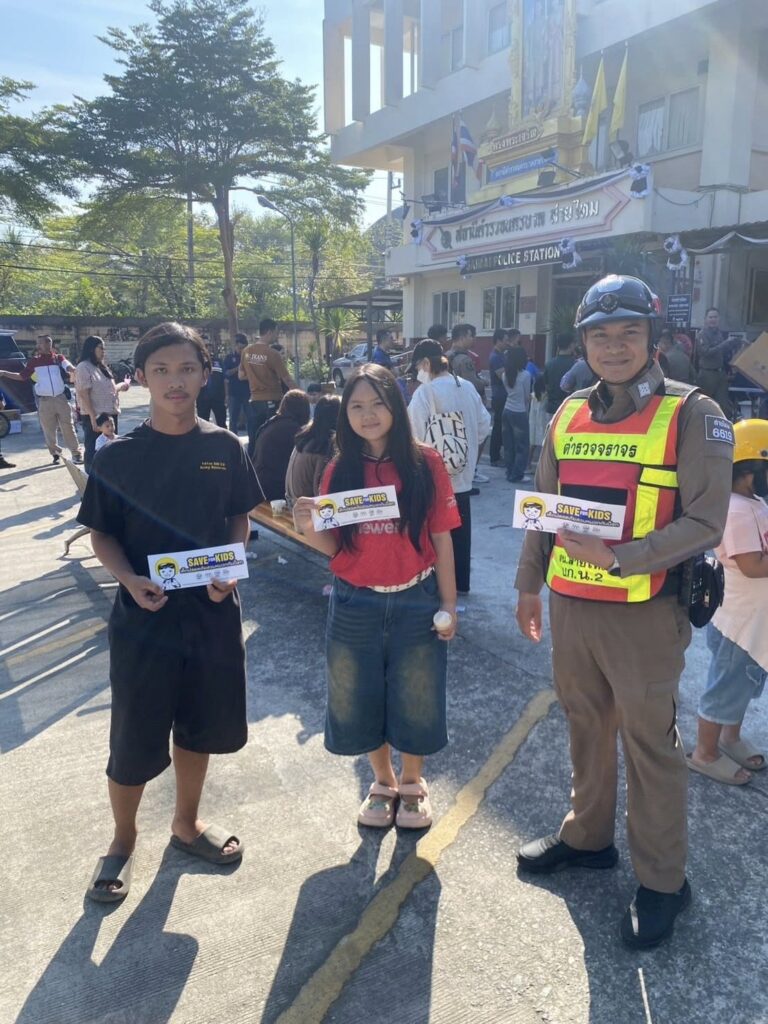 พร้อมเจ้าหน้าที่ตำรวจจราจร แจกหมวกนิรภัยให้กับเด็กๆ ในวันเด็กแห่งชาติ ตามโครงการ SAVE FOR KIDS เด็กปลอดภัยสวมหมวกนิรภัยเพื่อป้องกันอุบัติเหตุจากการโดยสารรถจักรยานยนต์